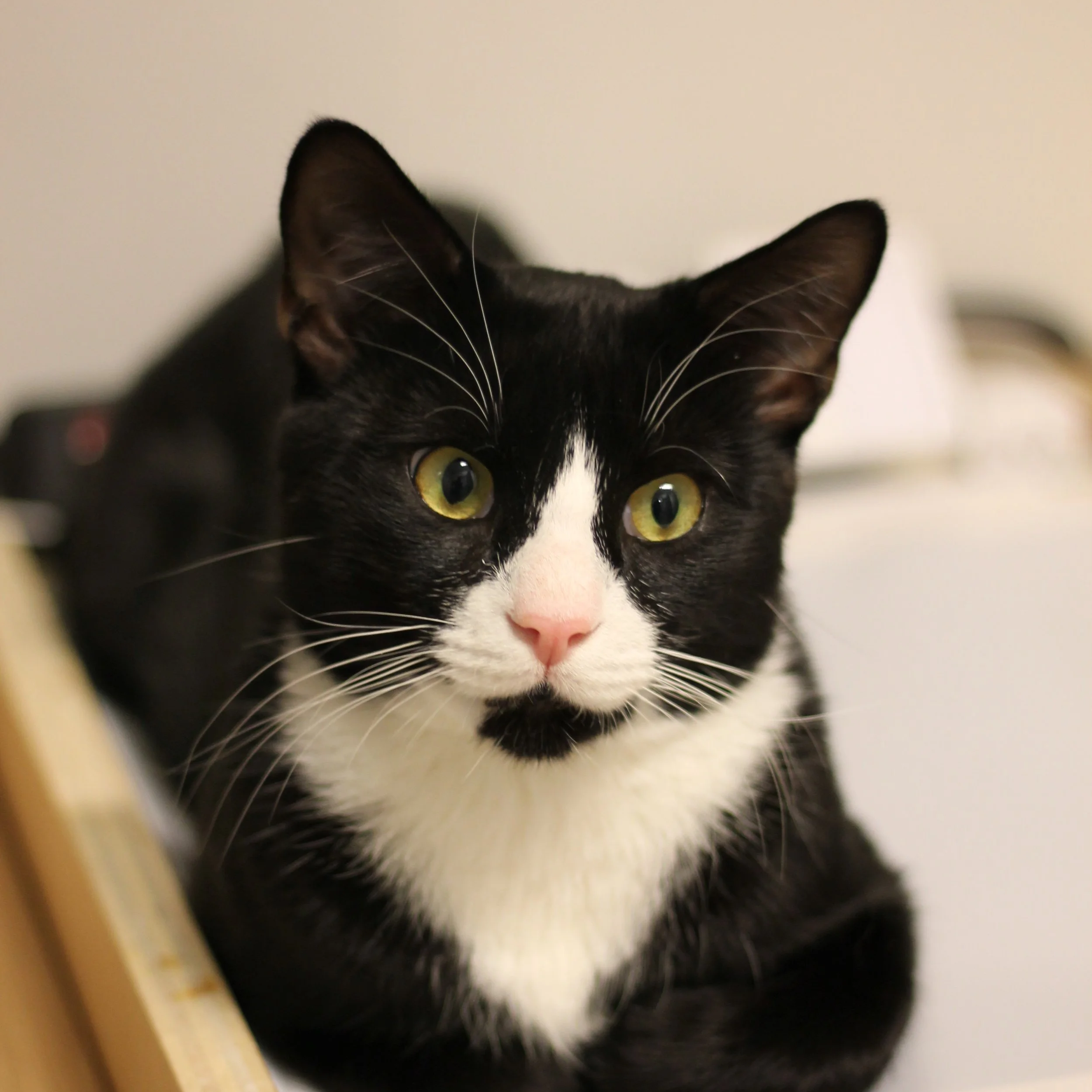Kermit is a one year old who has melted our hearts already with his friendliness and purr-sonality. He was rescued as a stray by the pawsome people at Commonwealth Cats and brought to PALS. He is getting braver by the day, feeling more comfortable around people and joining in for cat play sessions. Although he has been known to dance along to the “Rainbow Connection” song, he has never been heard to sing “It’s Not Easy Bein’ Green”. This tuxedo loves to show his Muppety side by acting goofy and friendly with the rest of the gang of kitties.