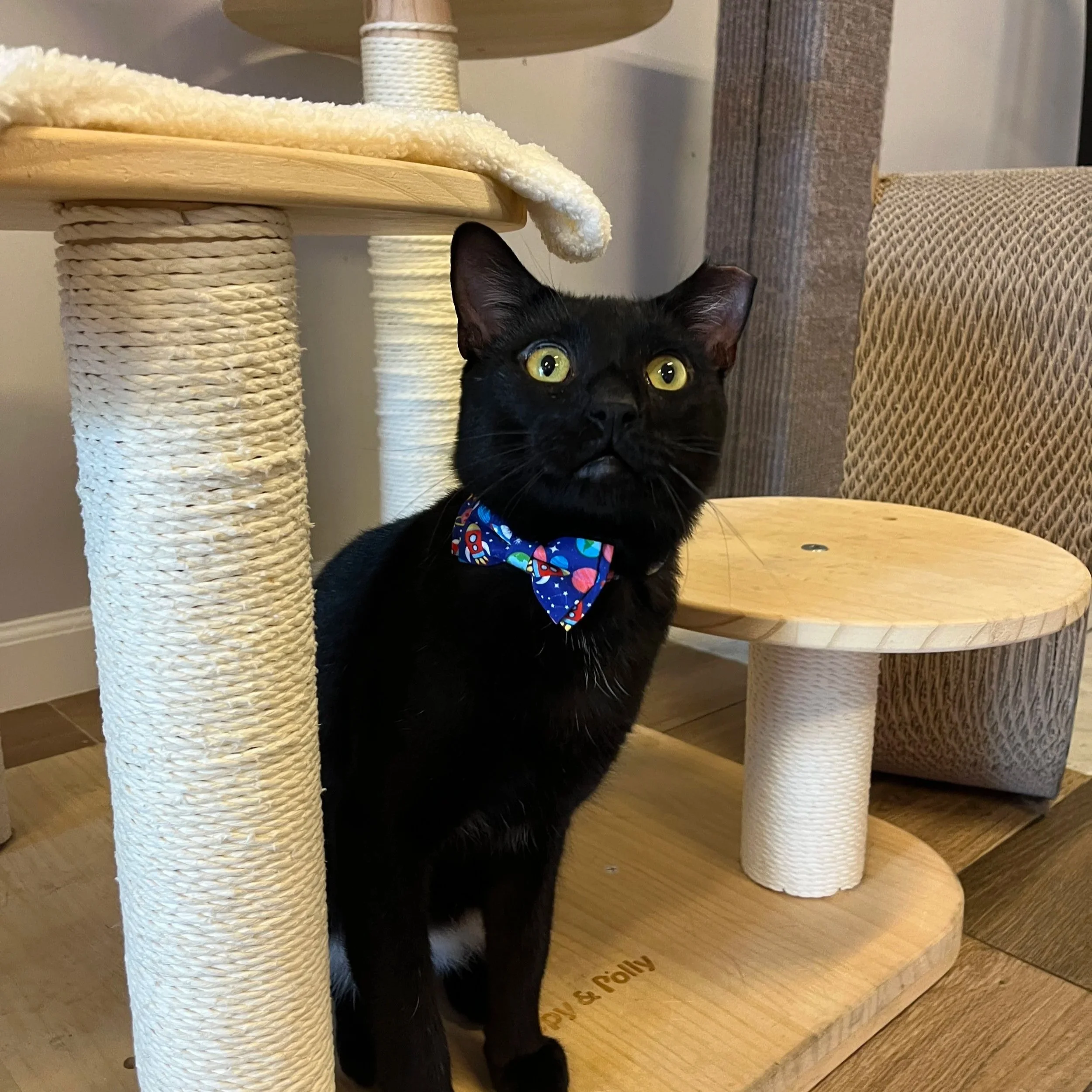 When you glance at Orion’s orb-like golden eyes and sleek, jet-black fur, it makes you feel as if you’ve fallen into a black hole! This social 1 year old came to us as a stray from PALS and has melted us already with his sweetness. A little ball of energy, Orion can frequently be seen zooming around the cafe and roughhousing playfully with the other cats. Orion is a true explorer, willing himself to investigate other cats, humans, or the occasional overturned cardboard box. Orion can also sometimes be seen rocking his dapper outer space bowtie!