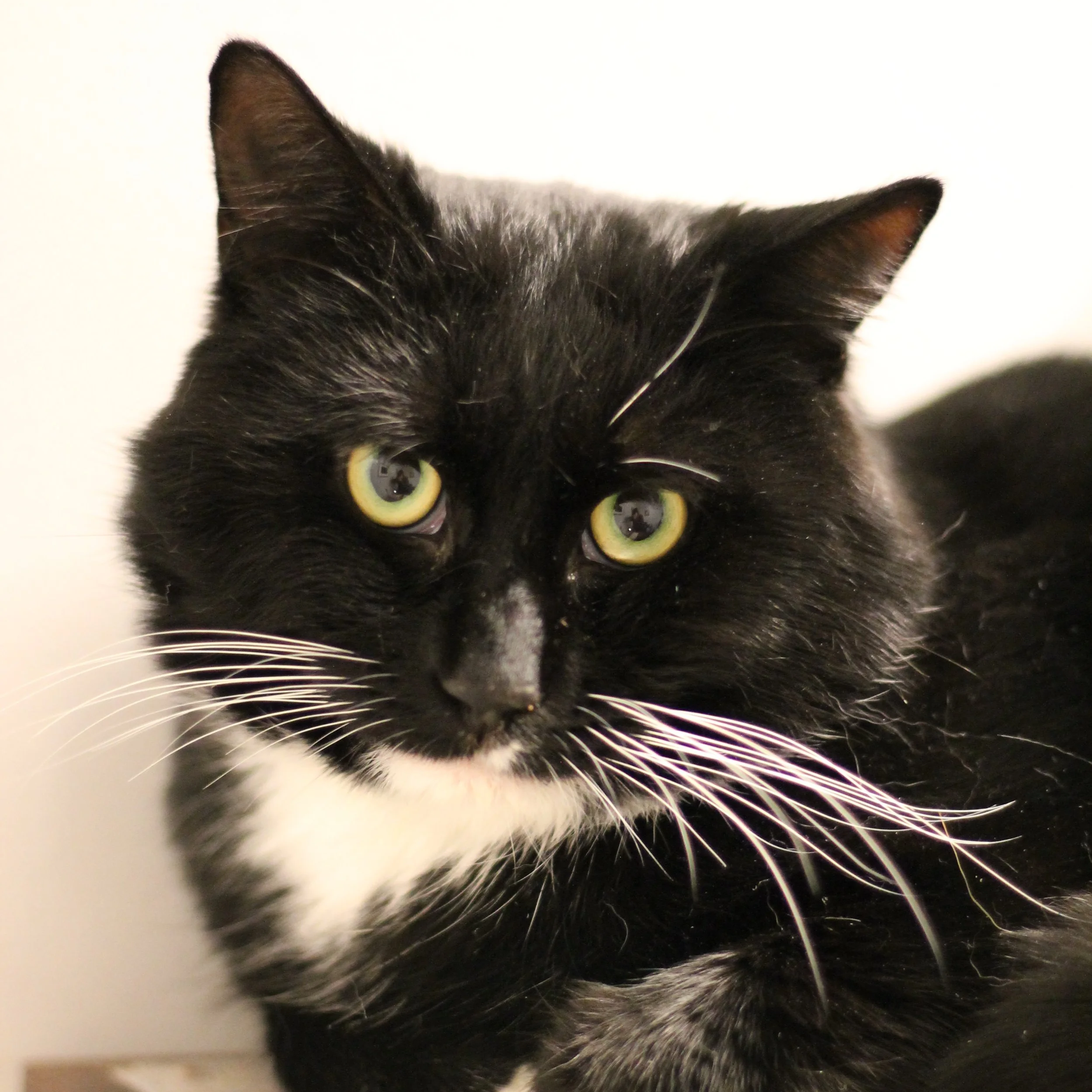 This fluffy 1 year old tuxedo was rescued as a stray by PAWS Wakefield. He was in the same area as Bobbi, so maybe they/re related in some way! Chester is starting off as shy but curious, accepting some pets and definitely loving the power of Churu.