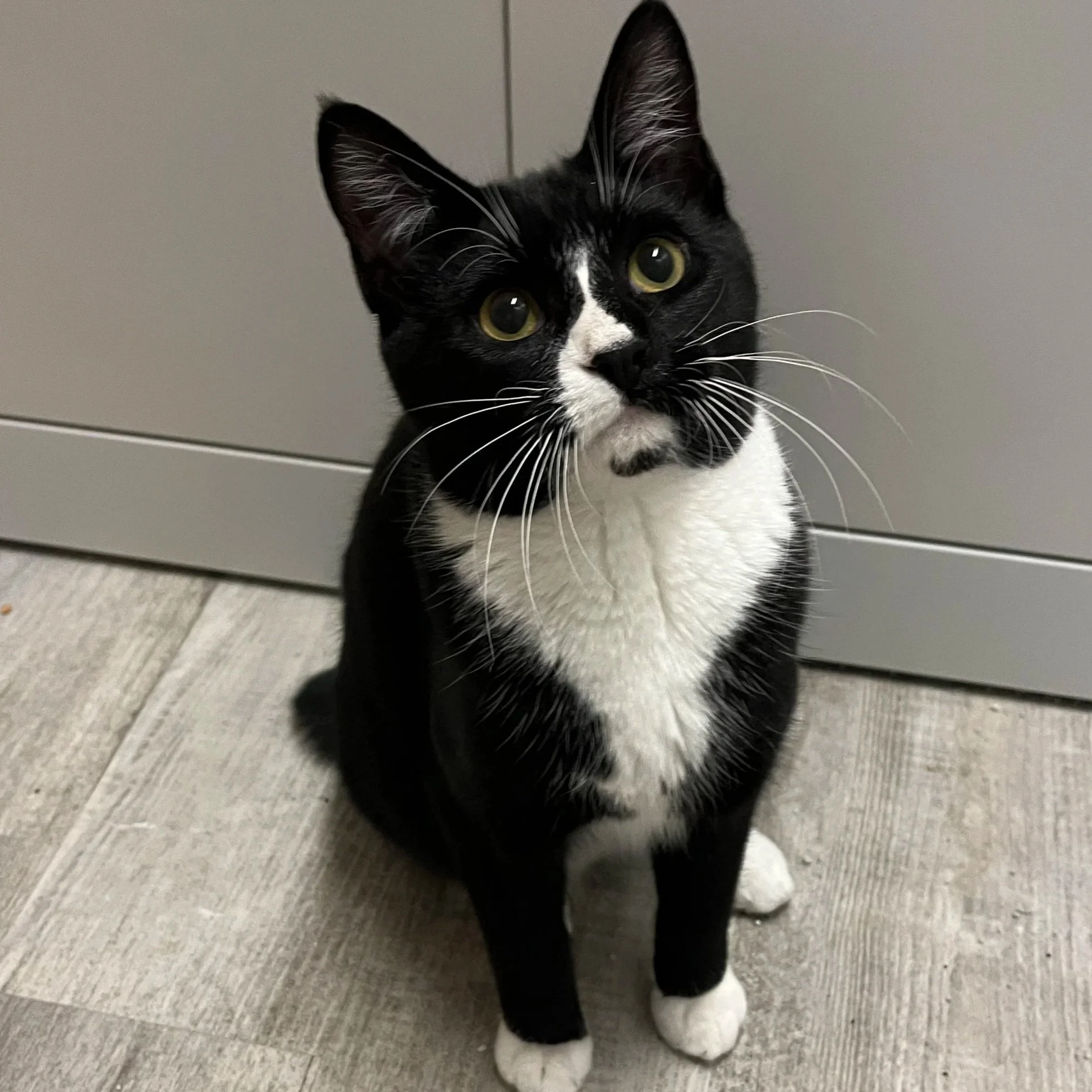 Bobbi (aka Ms. Suits) is a 7 month old tuxedo superstar who was rescued by PAWS. She is still quite shy, but very curious and playful once she gets used to you. Bobbi also sports the cutest bobtail that we’ve never seen yet on a tuxedo cat!